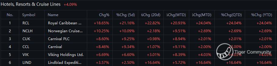 The best-performing concepts is Hotels, Resorts & Cruise Lines. Considering the different perceptions of the stock, this time TigerPicks chose $Royal Caribbean Cruises(RCL)$ $Norwegian Cruise Line(NCLH)$ $Carnival PLC(CUK)$ $Carnival(CCL)$ $Viking Holdings Ltd.(VIK)$ $Lindblad Expeditions(LIND)$ to have a fundamental highlight to help users understand it better.