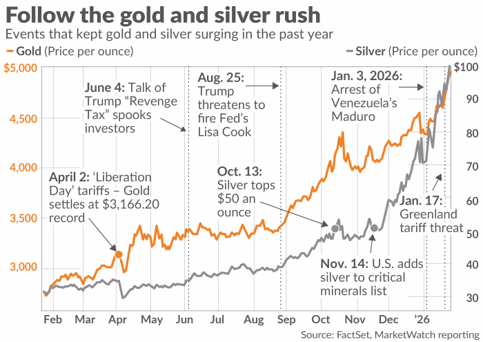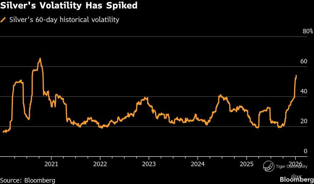 Silver was even more dramatic: record highs near $120–$122/oz, followed by drops of 10–17% (briefly below $100, lows ~$95), with massive intraday ranges and futures gaps.