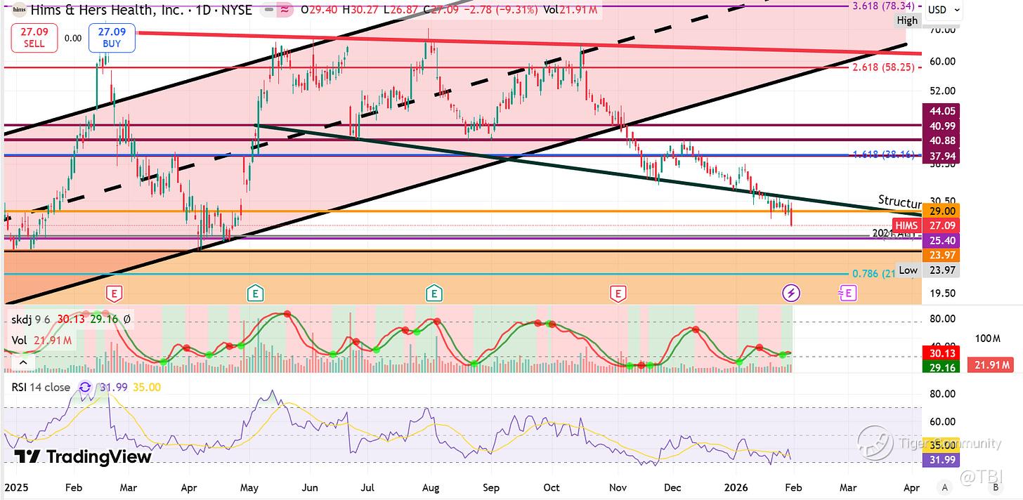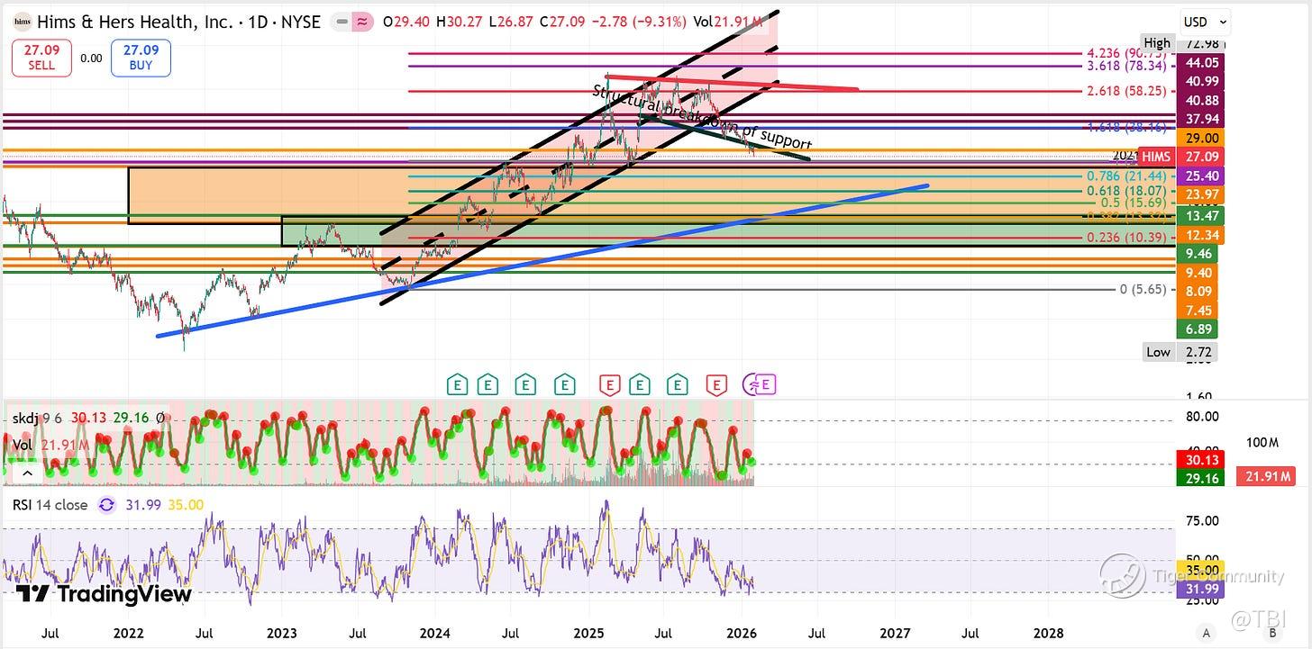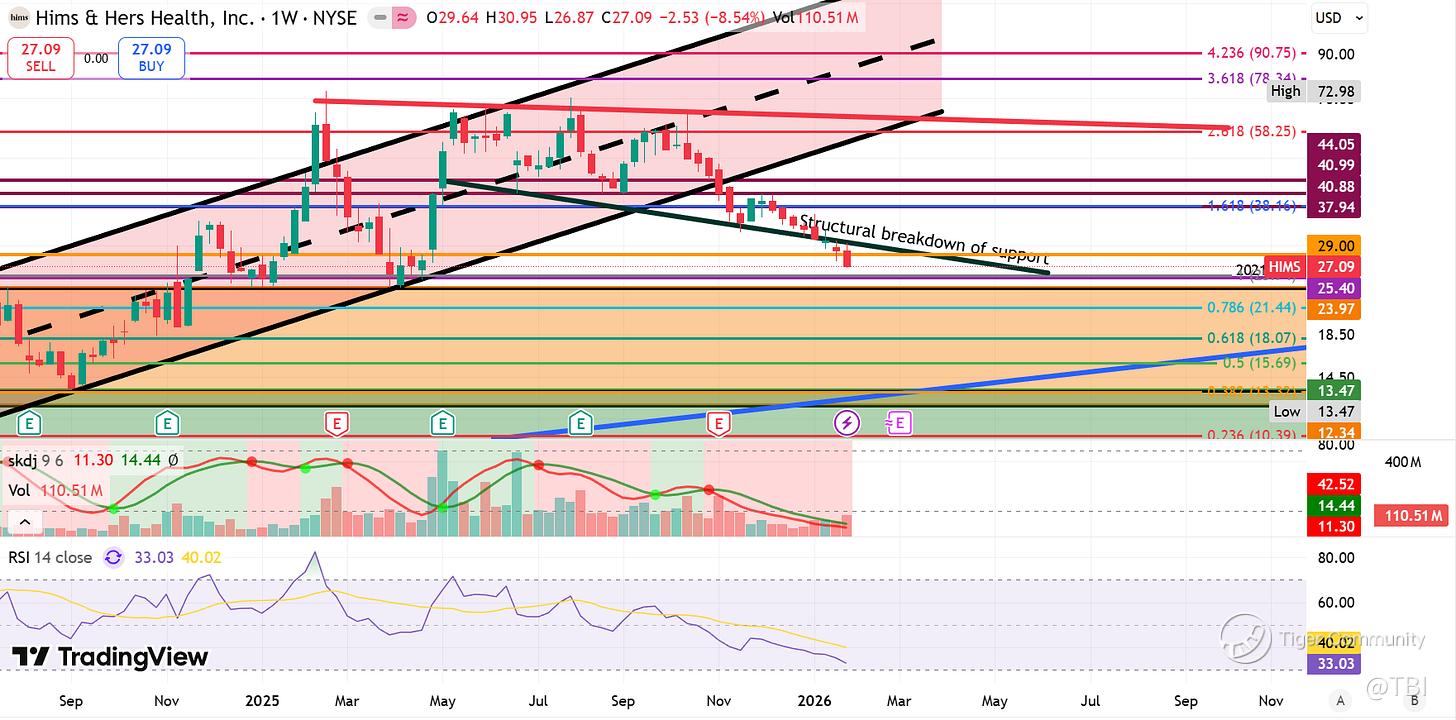 HIMS broke down from its descending support trendline as well as the 29 weekly level.