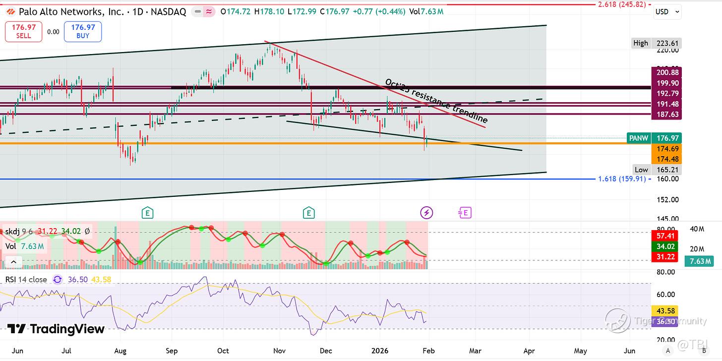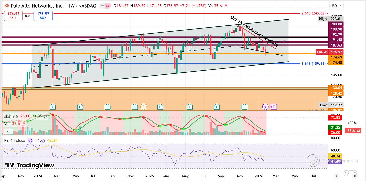 PANW is creating a series of rejections below monthly levels. Following Friday’s session, it closed just below the descending support trendline shown above, albeit above the 174.48-174.69 weekly imbalance, which was filled earlier this week.