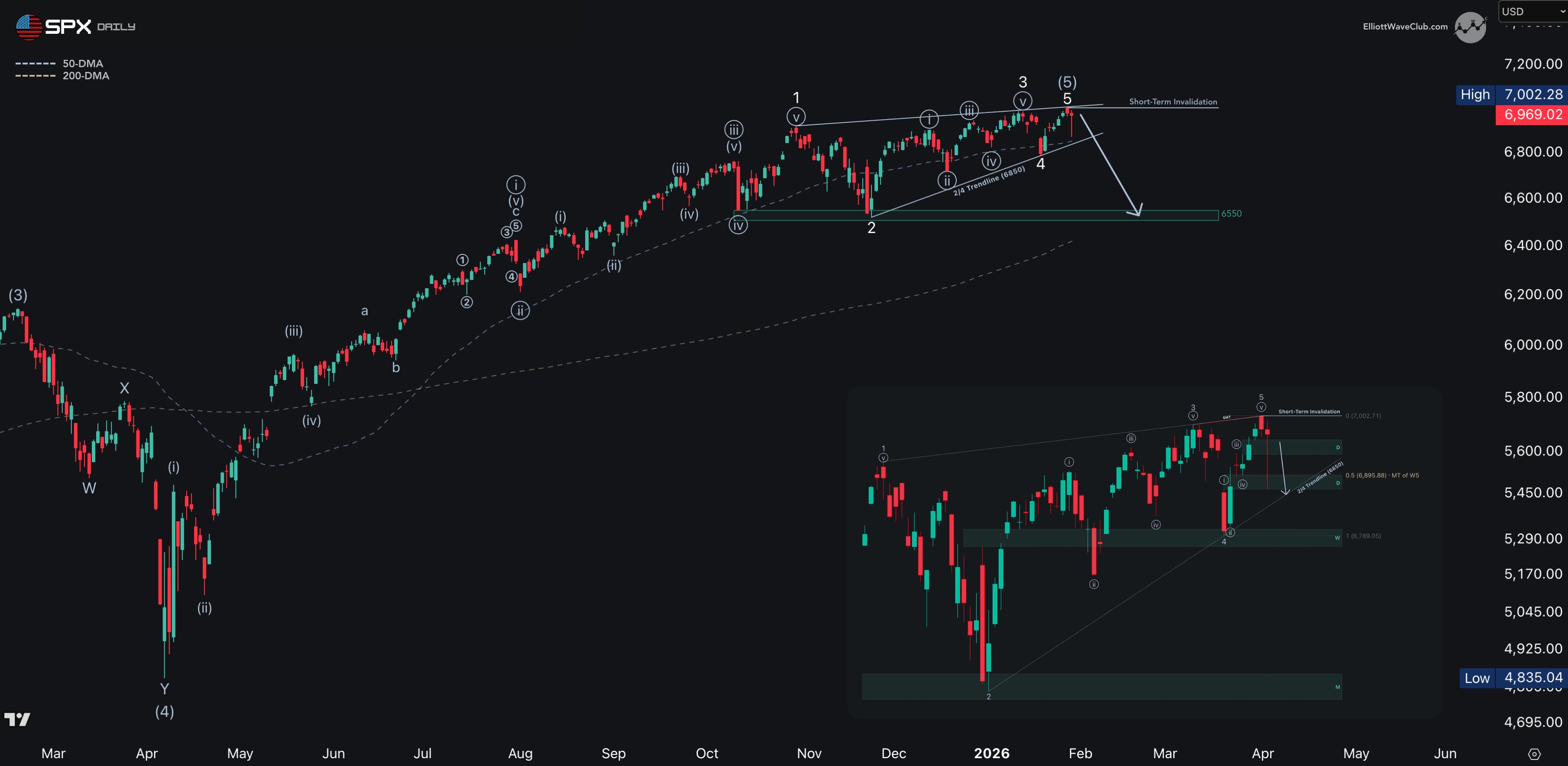 After hitting the 7000 target, price retraced 50%+ of W5 — raising the odds that W5 of Wave 5 is complete and a macro top is in.
