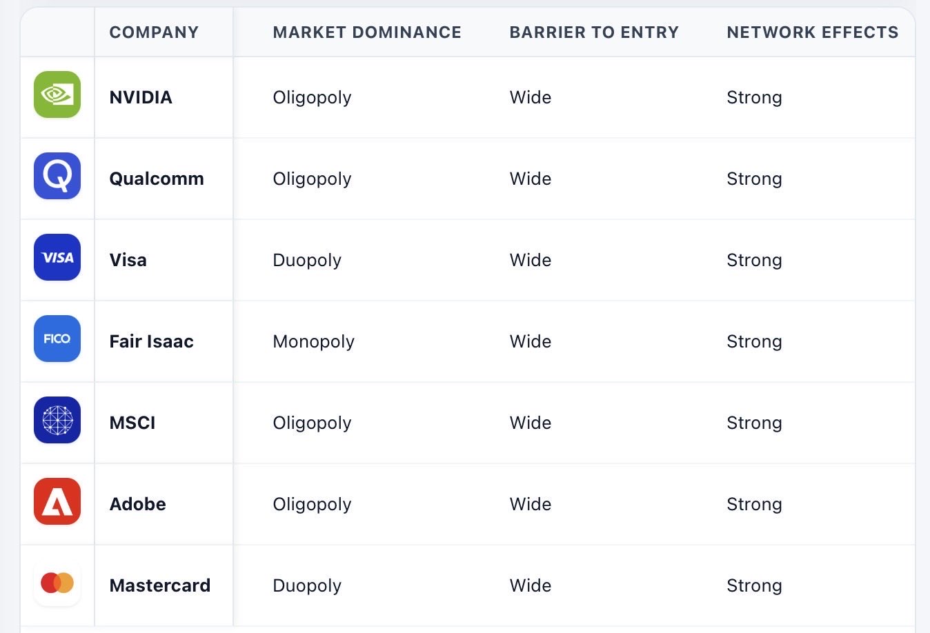 $NVIDIA(NVDA)$ $Qualcomm(QCOM)$ $Visa(V)$ $Fair Isaac(FICO)$ $MSCI Inc(MSCI)$ $Adobe(ADBE)$ $MasterCard(MA)$