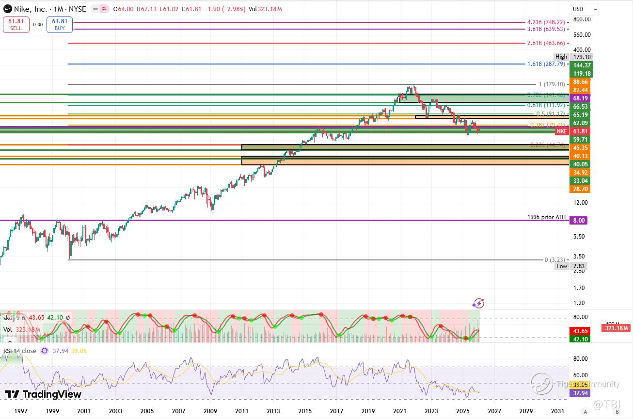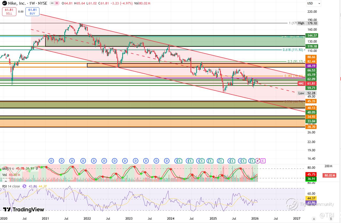 If NKE loses the 59.71 level, it could see a much deeper slide back into the 45.35 yearly and half-yearly imbalance, alongside the 44.74 Fib level.