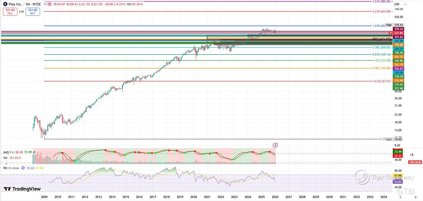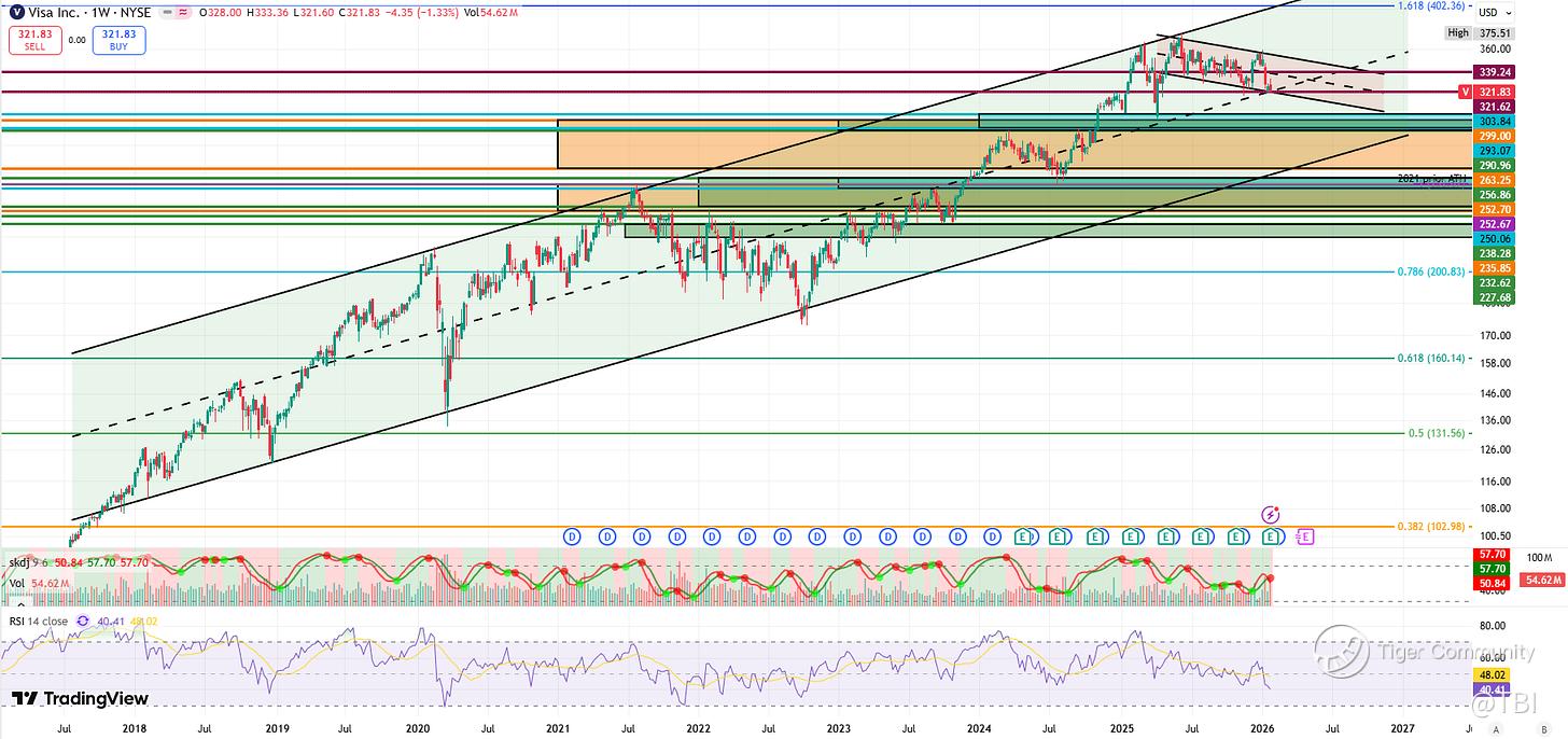 However, if V holds 321.62 and breaks out of the descending channel, it should see a move back into ATHs and eventually the 1.618 Fib extension at 402.36.