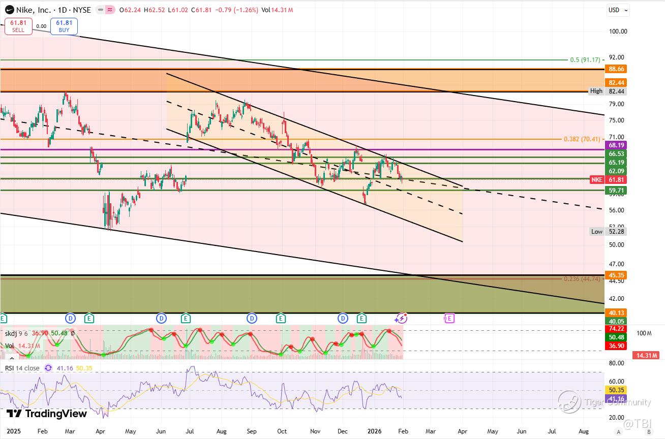 The key for a reversal on NKE is to reclaim the 68-70 resistance while breaking out of its near-term yellow descending channel. Otherwise, further controlled selling to the downside could be more likely.