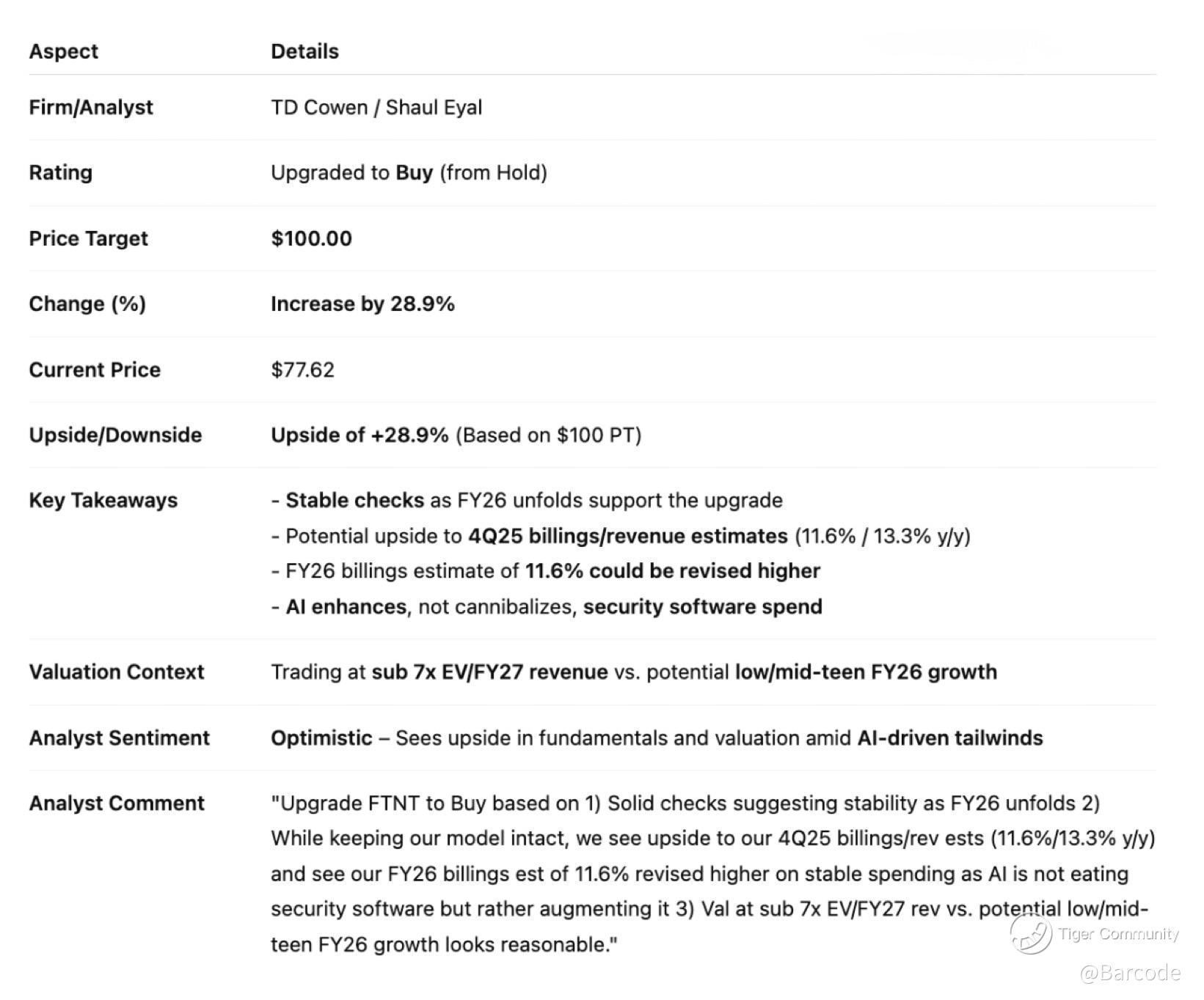 • TD Cowen upgrading to Buy with a $100 target, citing resilient enterprise demand and AI augmenting cybersecurity spending