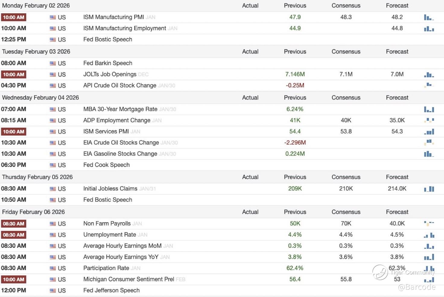 Friday is the centrepiece with Nonfarm Payrolls, unemployment, wages and consumer sentiment. Expectations cluster near 65K to 70K job additions, unemployment near 4.4%, and wage growth steady near 0.3% monthly. Cooling hiring without labour deterioration is the outcome risk assets want.