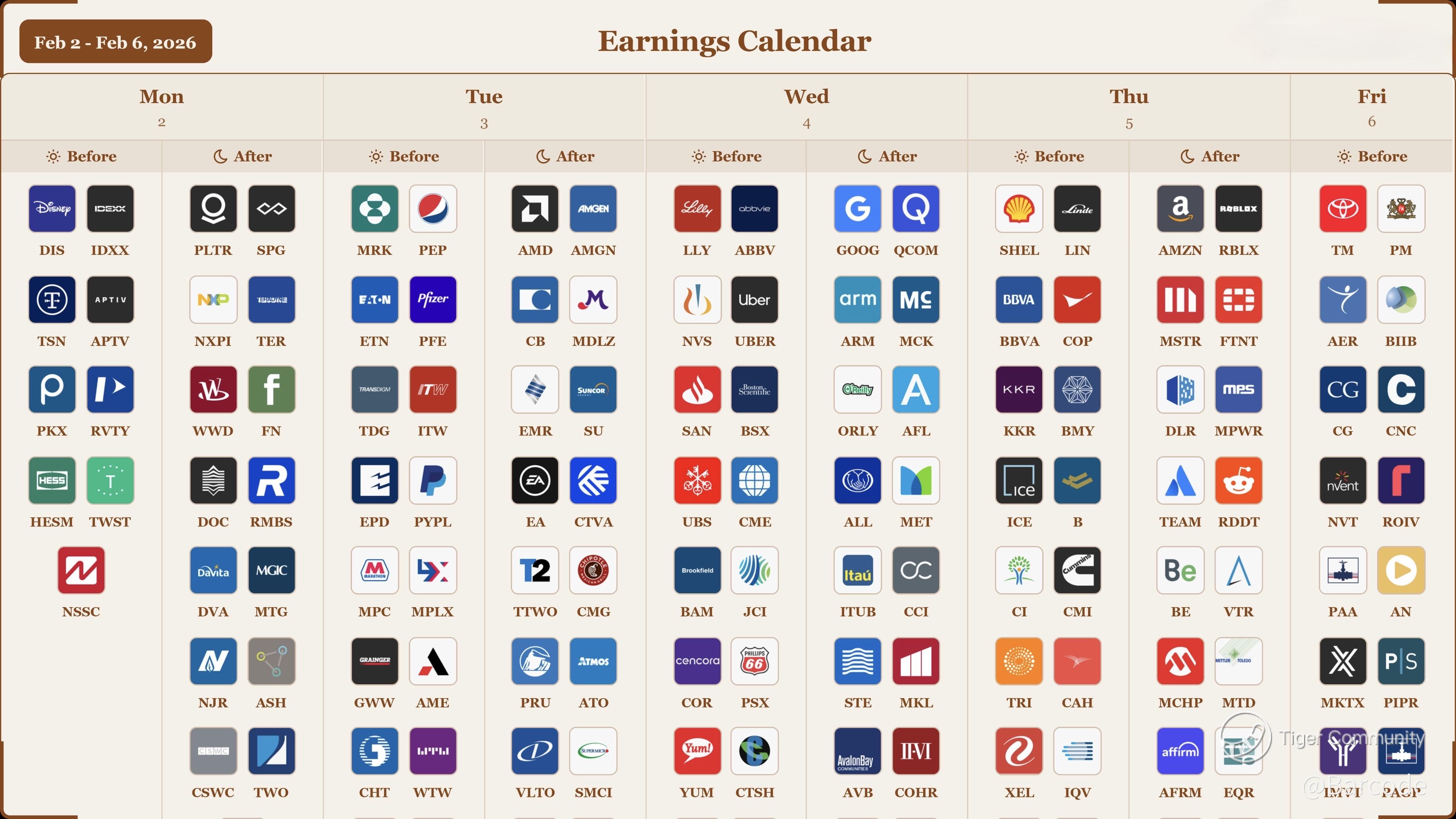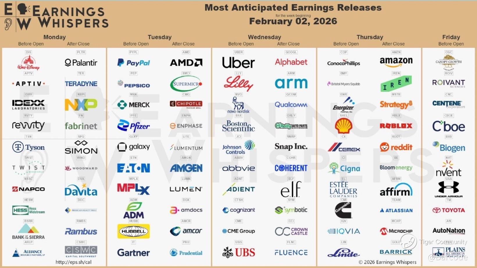 Two Mag-7 giants, $AMZN and $GOOGL, headline the week alongside $AMD, $ARM, $PLTR, $QCOM, $SMCI, $UBER, $DIS, $PYPL, $LLY, $RDDT, $IREN and $BE.
