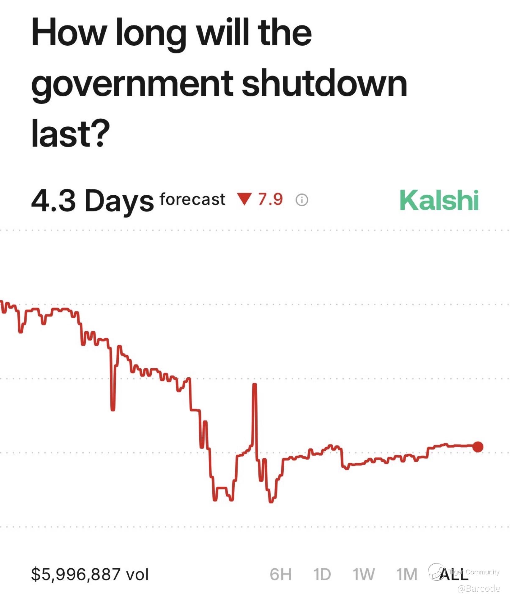 Prediction markets currently see the US government shutdown lasting roughly 4.3 days, with probabilities skewed toward resolution early this week.