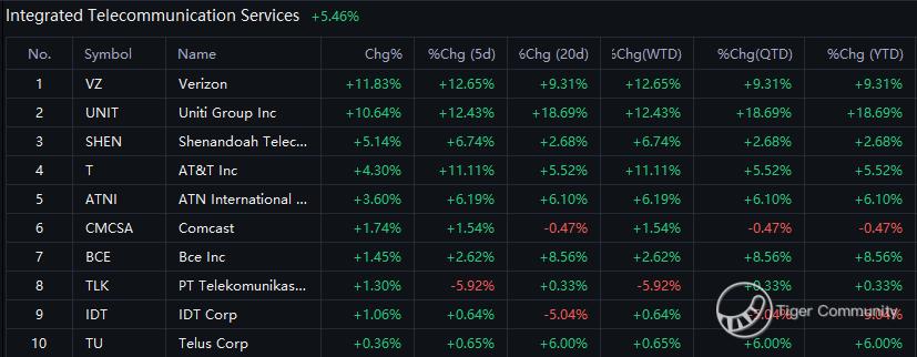 The best-performing concepts is Integrated Telecommunication Services. Considering the different perceptions of the stock, this time TigerPicks chose $Verizon(VZ)$ $Uniti Group Inc(UNIT)$ $Shenandoah Telecommunications(SHEN)$ $AT&T Inc(T)$ $ATN International Inc(ATNI)$ $Comcast(CMCSA)$ $Bce Inc(BCE)$ $PT Telekomunikasi Indonesia (Persero) Tbk(TLK)$ $IDT Corp(IDT)$ $Telus Corp(TU)$ to have a fundamental highlight to help users understand it better.