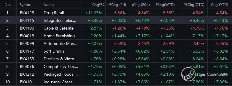 The Integrated Telecommunication Services sector rose an average of ~5.46% at the February 1, 2026 ET market close, primarily driven by continued momentum from $Verizon(VZ)$ 's strong Q4 earnings beat, optimistic 2026 guidance, and $25B buyback announcement, along with positive follow-through in $AT&T Inc(T)$ and $T-Mobile US(TMUS)$ shares amid sector rotation into defensive telecom plays.