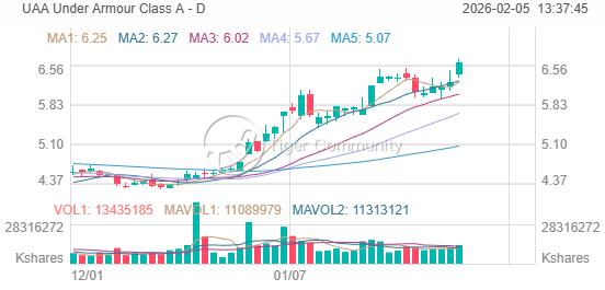 UAA surged to close at $6.61 on Feb 4, up +5.93% from the previous close of $6.24. The stock is now 23.6% below its 52-week high of $8.65.