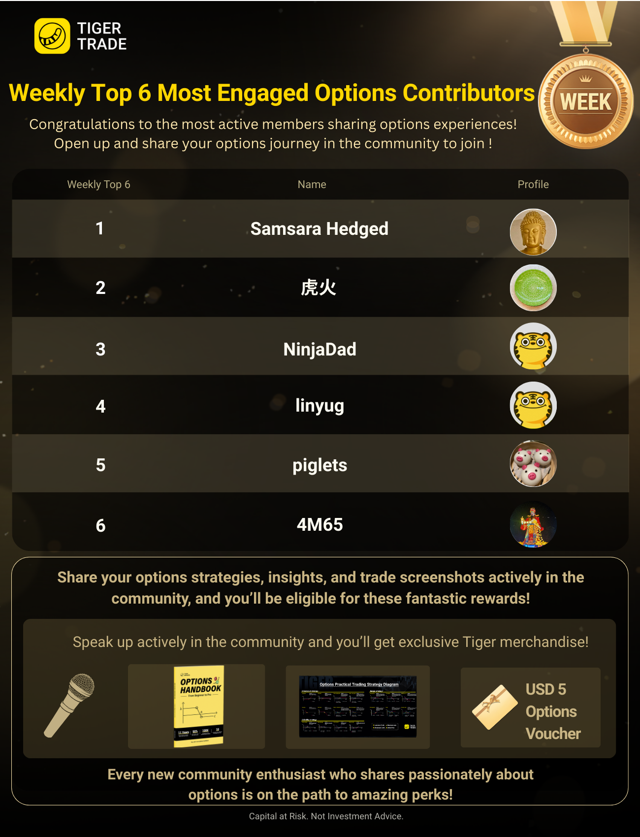 Let’s give a big round of applause to our winners! @Samsara Hedged, @piglets, and @4M65 have each earned an options handbook. @虎火 and @linyug both take home an options mouse pad, and @NinjaDad wins a USD 5 options voucher. Keep sharing your options insights to join this winning circle!