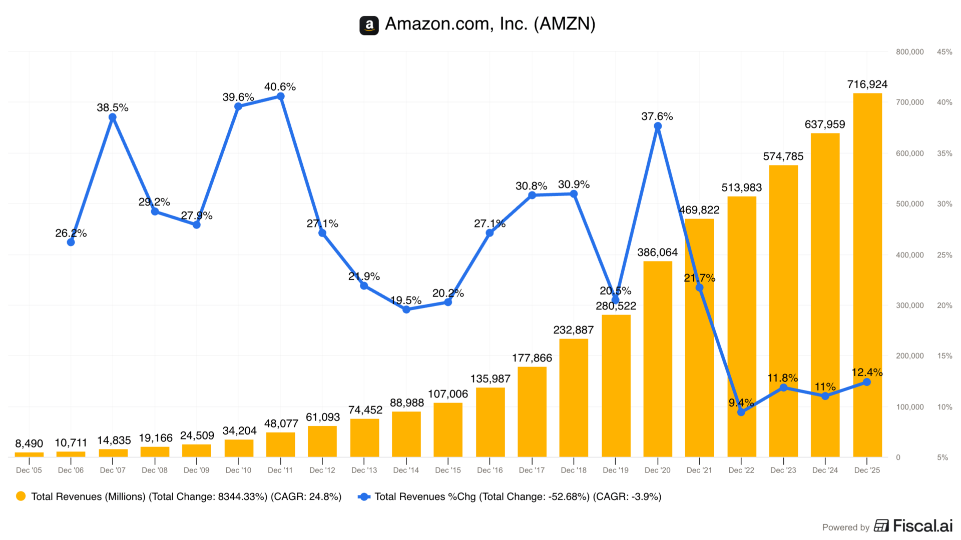 Amazon’s growth chart looks like a steady climb up and to the right. And in many ways, it was with growth rates over 20% for most of the last two decades.