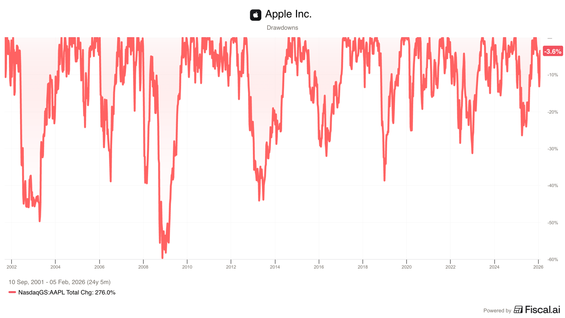 But investors have fallen in and out of love with Apple’s stock. Shares fell 45% in 2003, 60% in 2008, 44% in 2014, and so on.