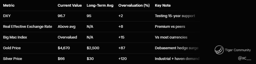 This year's dollar slide (down 10% from January peaks) reflects overvaluation β above long-term real averages and Big Mac index showing premium against most currencies. Precious metals surge as alternatives, with gold at $4,670 (up 75% yearly) provoking speculation on debasement protection. Central banks' diversification continues, but dollar's dominance in banking, trade, debt, and FX deals shields from full rout β yet the spasms offer glimpses of a topsy-turvy future where US assets lose haven appeal. Tariff escalations spike yields 0.1%, but QT's $1T flood buffers for resilient holds. Emerging economies like Brazil's commodity glow pull 2% more demand, turning Asia's STI at 4,500 on bank yields into diversification wins. Geopolitical tensions crimp EM 5%, but gold's structural bid from CB buys shines bright amid the chaos.