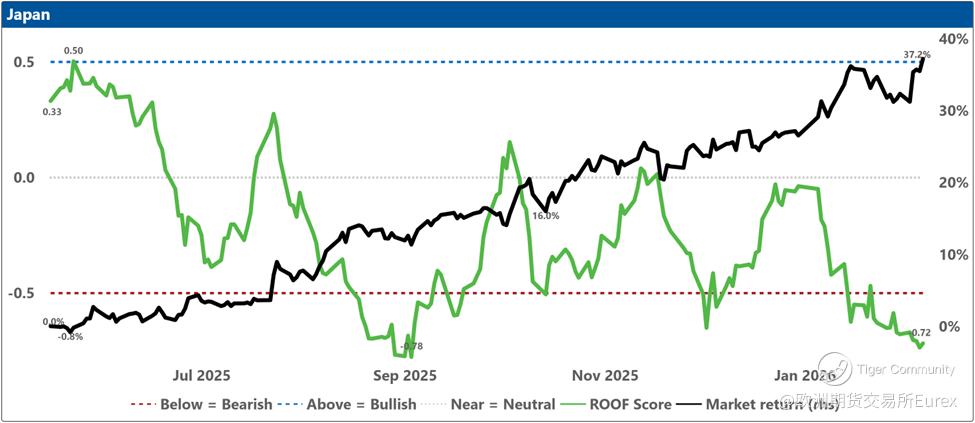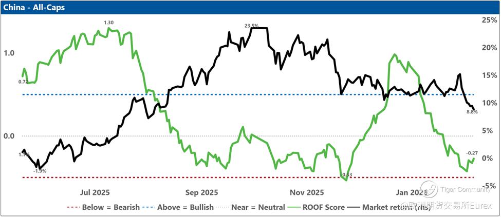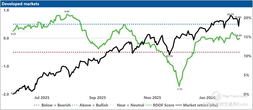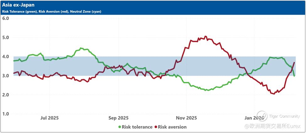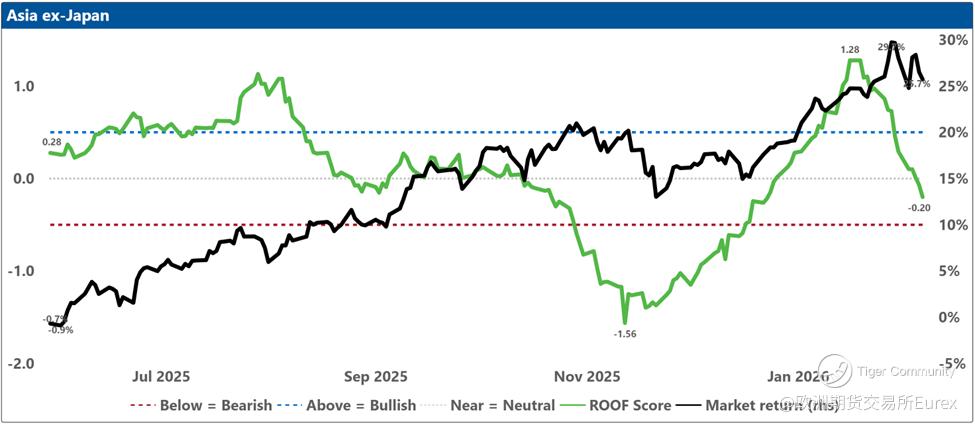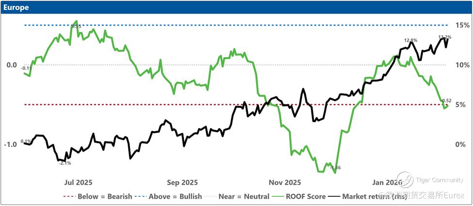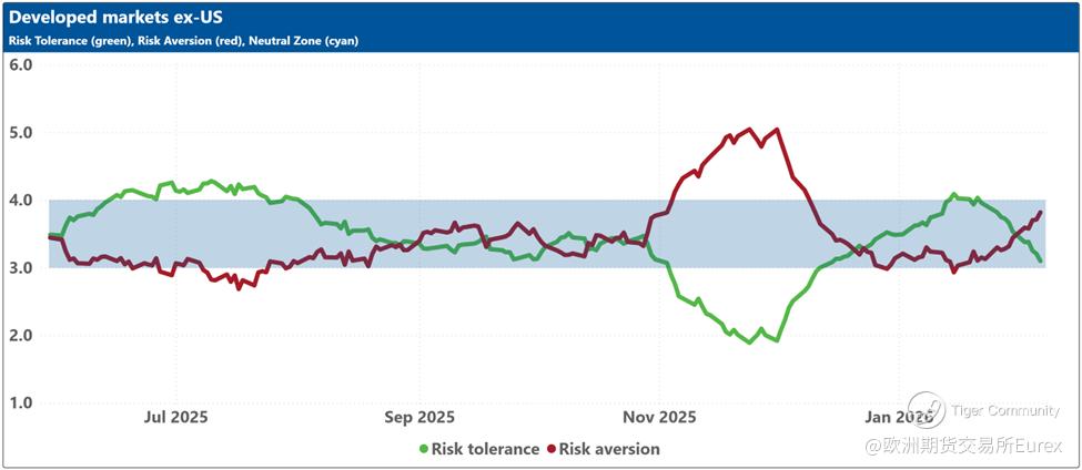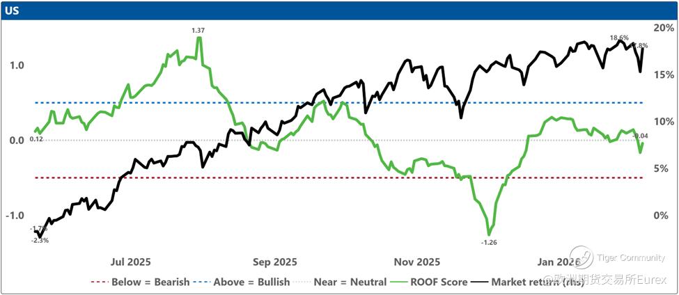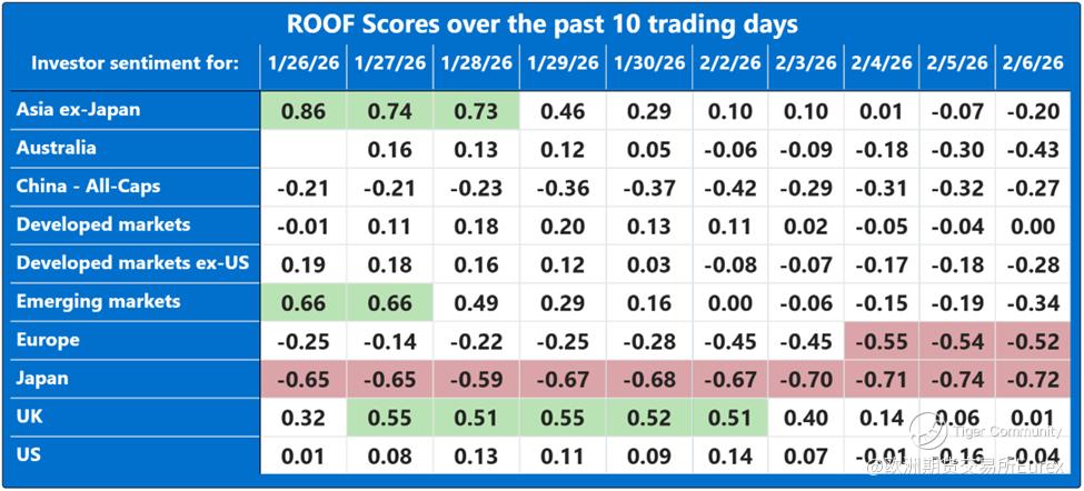Over the past two weeks, investor sentiment weakened across most major markets except China, where it remained consistently negative, and the United States, where it held steady at neutral. Sentiment in Japan dipped slightly ahead of the snap elections, though the ruling coalition’s subsequent supermajority win should give Takaichi ample room to pursue her “proactive fiscal policy,” a likely positive for equities but less so for bonds. Is Canada next with a snap election (@Carney)? Meanwhile, geopolitical tensions involving Iran and renewed concerns about AI’s economic impact continue to restrain sentiment despite stronger‑than‑expected earnings so far (with 54% reported), which helped lift the Dow Jones Industrial Average above 50,000 for the first time in its 129‑year history.