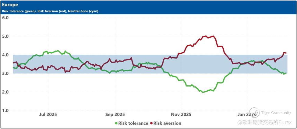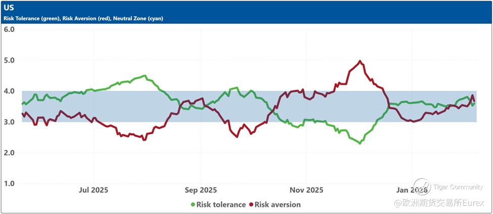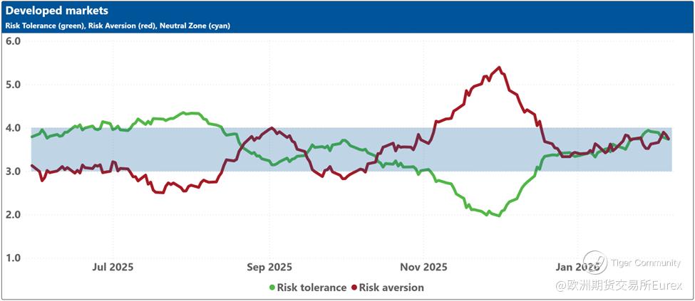 The bottom charts display the levels of risk tolerance (green line) and risk aversion (red line) within the market, representing investors' demand and supply for risk, respectively. Key insights include: