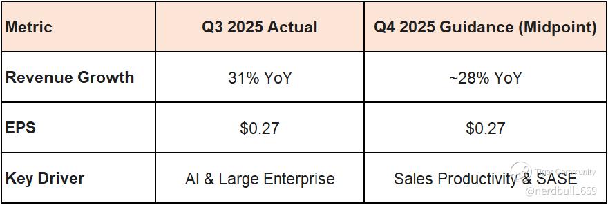 Despite the massive reacceleration to 31% growth in Q3, management provided Q4 revenue guidance of $588.5M – $589.5M, which implies a slight deceleration back to 28% growth.