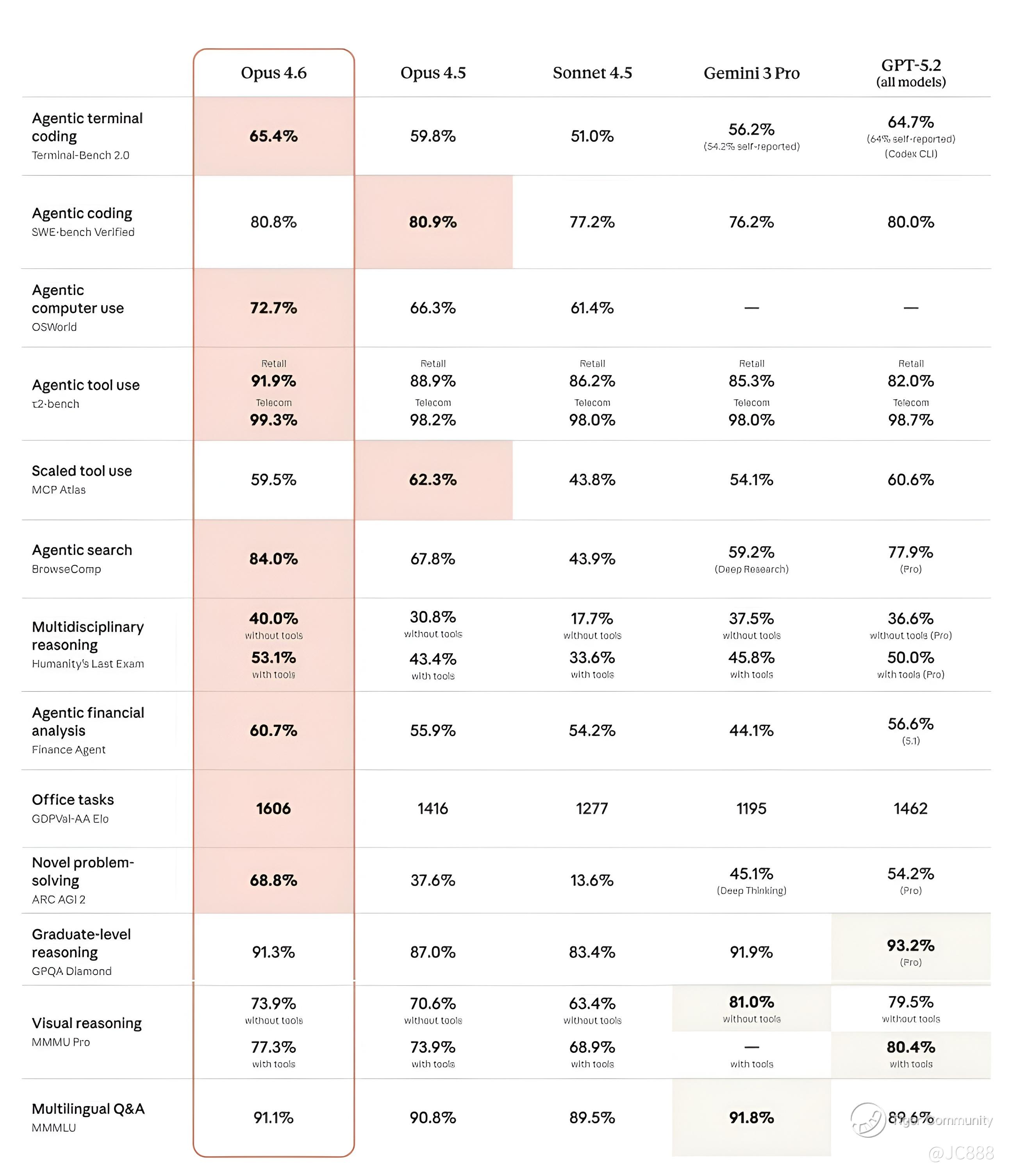 In terms of coding ability, Opus 4.6 achieved the highest score in the Terminal - Bench 2.0 evaluation against Gemini Google and OpenAI ChatGPT. (see below)