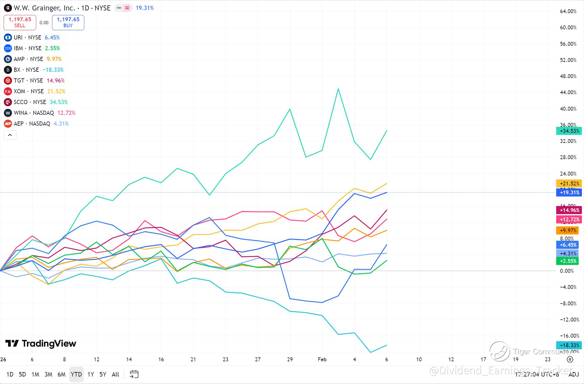 Based on 2026 TradingView metrics, $W.W. Grainger(GWW)$, $United Rentals(URI)$, $IBM(IBM)$, $Ameriprise(AMP)$, $Target(TGT)$, $Exxon Mobil(XOM)$, $Southern Copper Corp(SCCO)$ , $Winmark(WINA)$ , and $American Electric Power(AEP)$ all moved upward, while $Blackstone Group LP(BX)$ experienced a loss.