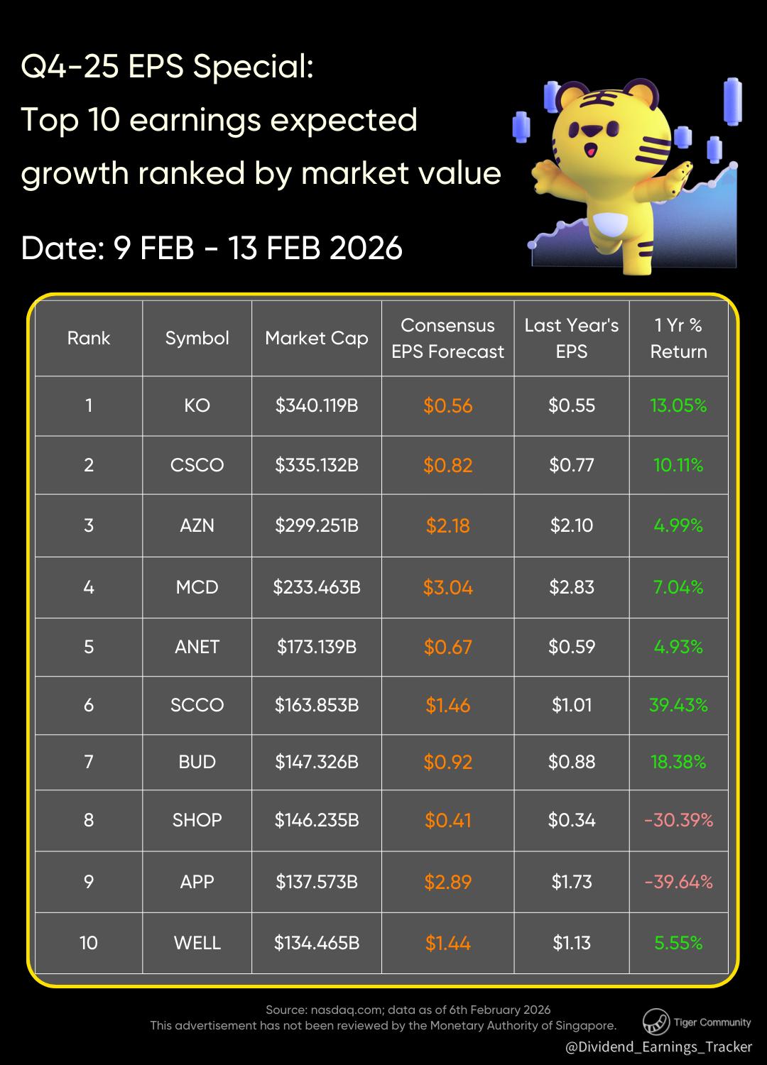 On February 9 to February 13, $Coca-Cola(KO)$ , $Cisco(CSCO)$ , $AstraZeneca PLC(AZN)$ , $McDonald's(MCD)$ , $Arista Networks(ANET)$ , $Southern Copper Corp(SCCO)$ , $Anheuser-Busch Inbev SA(BUD)$ , $Shopify(SHOP)$, $AppLovin Corporation(APP)$, $WELLTOWER OP LLC(WELL)$, $S&P Global(SPGI)$, $Vertex Pharmaceuticals(VRTX)$, $ENB$, $BP$, $AEM$, $BCS$, $MAR$, $HWM$, $SPOT$, and $WMB$ are expected to release their earnings, and consensus earnings per share forecasts are higher than data from the same period last year.