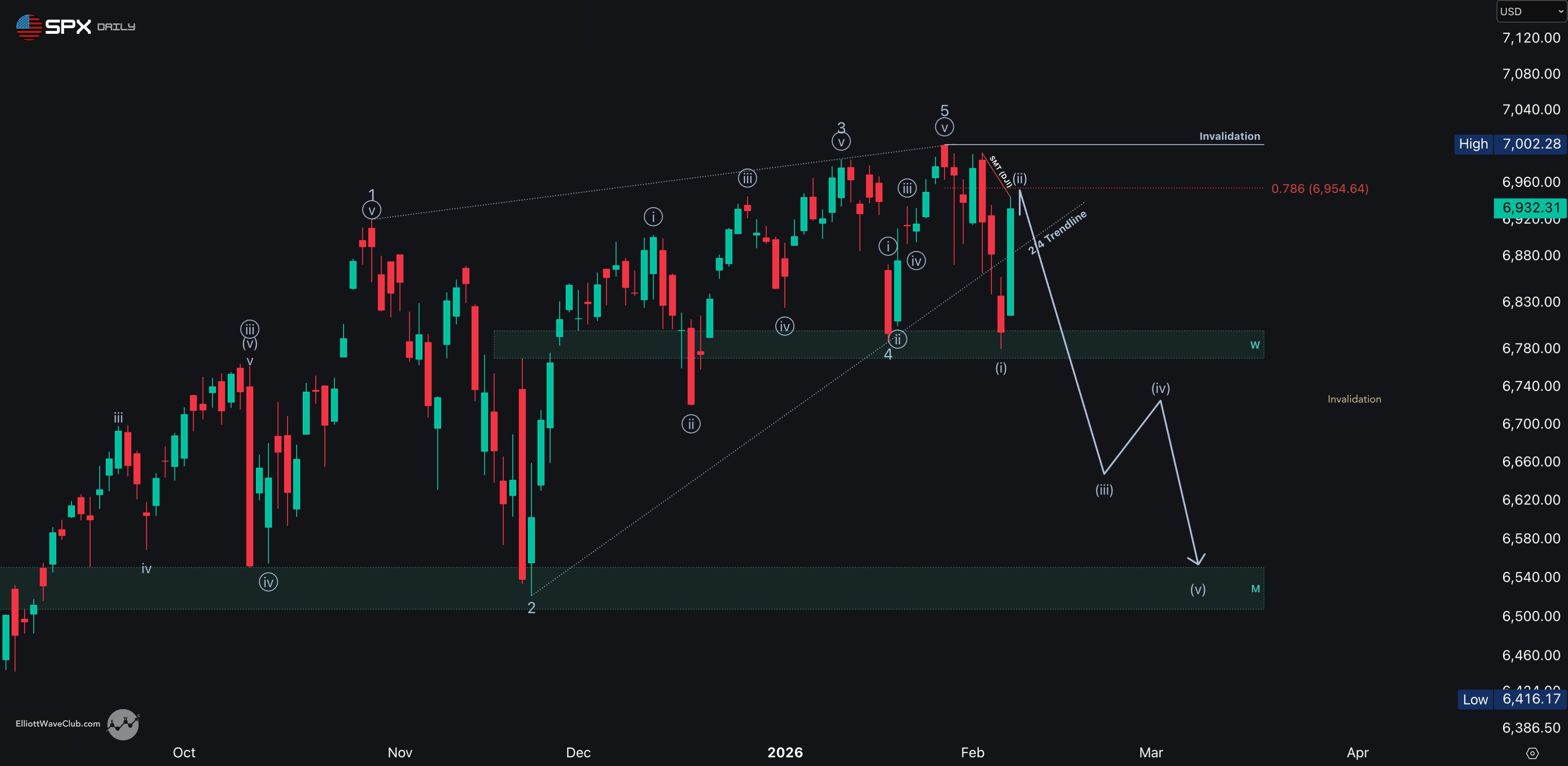 One more push. Marginal new high to 7025 to complete the structure — then it's over.