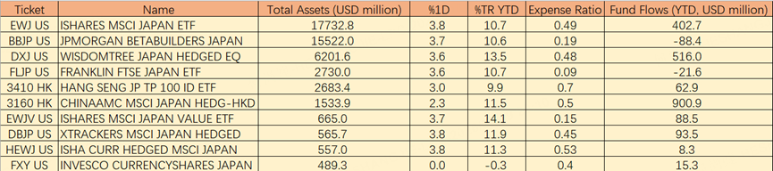 Japan-related ETFs also posted strong gains. $iShares MSCI Japan ETF(EWJ)$ , $Xtrackers MSCI Japan Hedged Equity ETF(DBJP)$ and $iShares Currency Hedged MSCI Japan ETF(HEWJ)$ each rose about 3.8% on the day, followed by $JPMorgan BetaBuilders Japan ETF(BBJP)$ and $iShares MSCI Japan Value ETF(EWJV)$ at around 3.7%, while $WisdomTree Japan Hedged Equity Fund(DXJ)$ and $Franklin FTSE Japan ETF(FLJP)$ gained roughly 3.6%.
