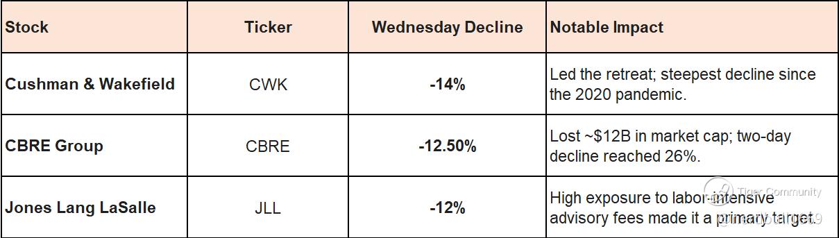 The "Big Three" of global real estate services bore the brunt of the Wednesday sell-off, with losses reminiscent of the 2020 pandemic crash.