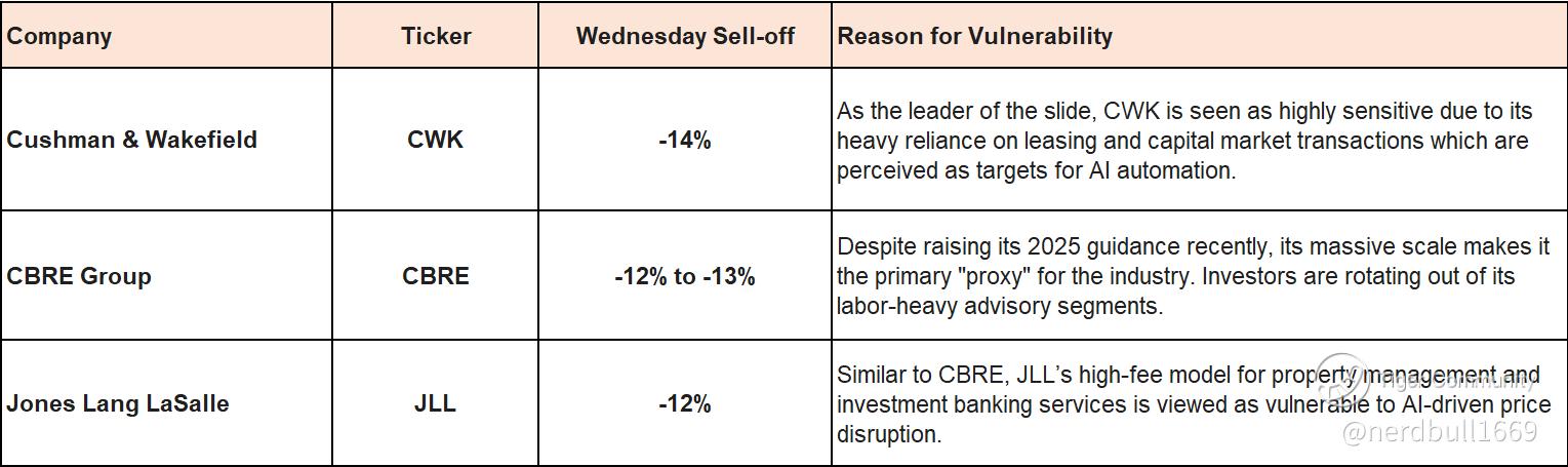 Job Market Disruption: Investors are concerned that AI agents can now perform "white-collar" tasks—such as underwriting deals, drafting complex lease agreements, and conducting market research—with a fraction of the human overhead. This threatens the high-fee, commission-based revenue of major firms that rely on large teams of junior analysts and brokers.