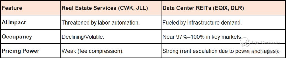 In the current market landscape, Data Center REITs (Real Estate Investment Trusts) are functioning as the "mirror image" of the struggling commercial real estate sector. While traditional real estate services are being sold off due to fears of AI replacement, Data Center REITs are seeing record inflows because they provide the physical floor space that AI requires to exist.