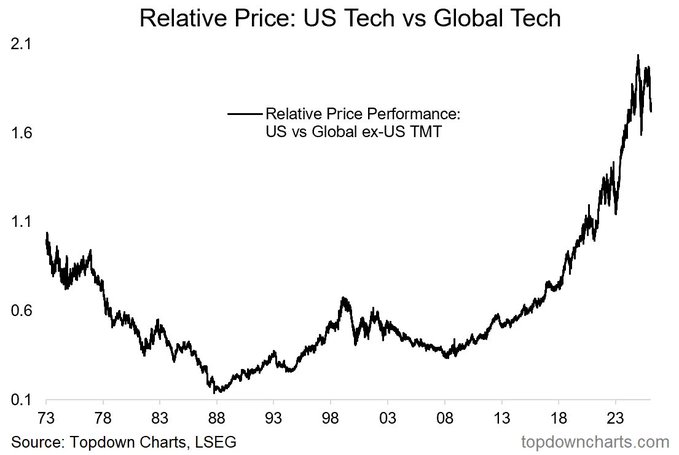 US tech stocks have peaked and are losing ground vs global tech stocks.