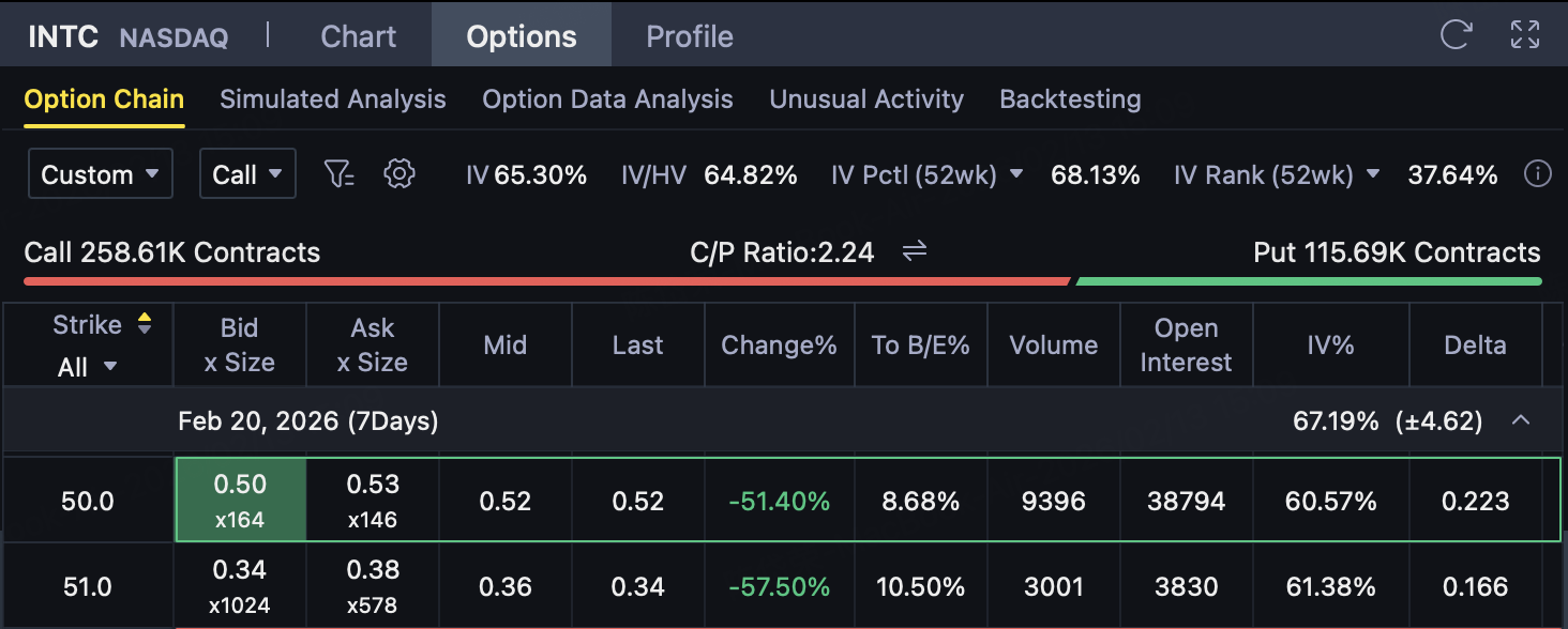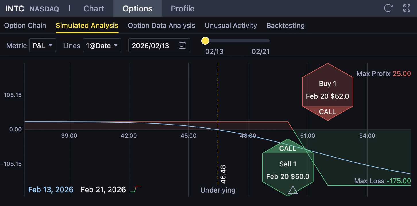 Based on the above-mentioned combination of "clear upper resistance and weakening market risk appetite",Using INTC's bear call spread (sell 50/buy 52) is more like betting on'rebounding past the line ': As long as INTC at expirationNot breaking 50, the strategy can retain net premium; Even if there is an unexpected rise, the risk is52The upper cap (the net income of your group of quotations$0.23/ShareMaximum loss$1.77/Share, breakeven point50.23, consistent with the logic of "pressure zone near 50"). If the subsequent index level continues to be dragged down by the weight of science and technology, this kind of "closing premium + capping above" structure is usually easier to manage the pullback/retracement than simply making directions.