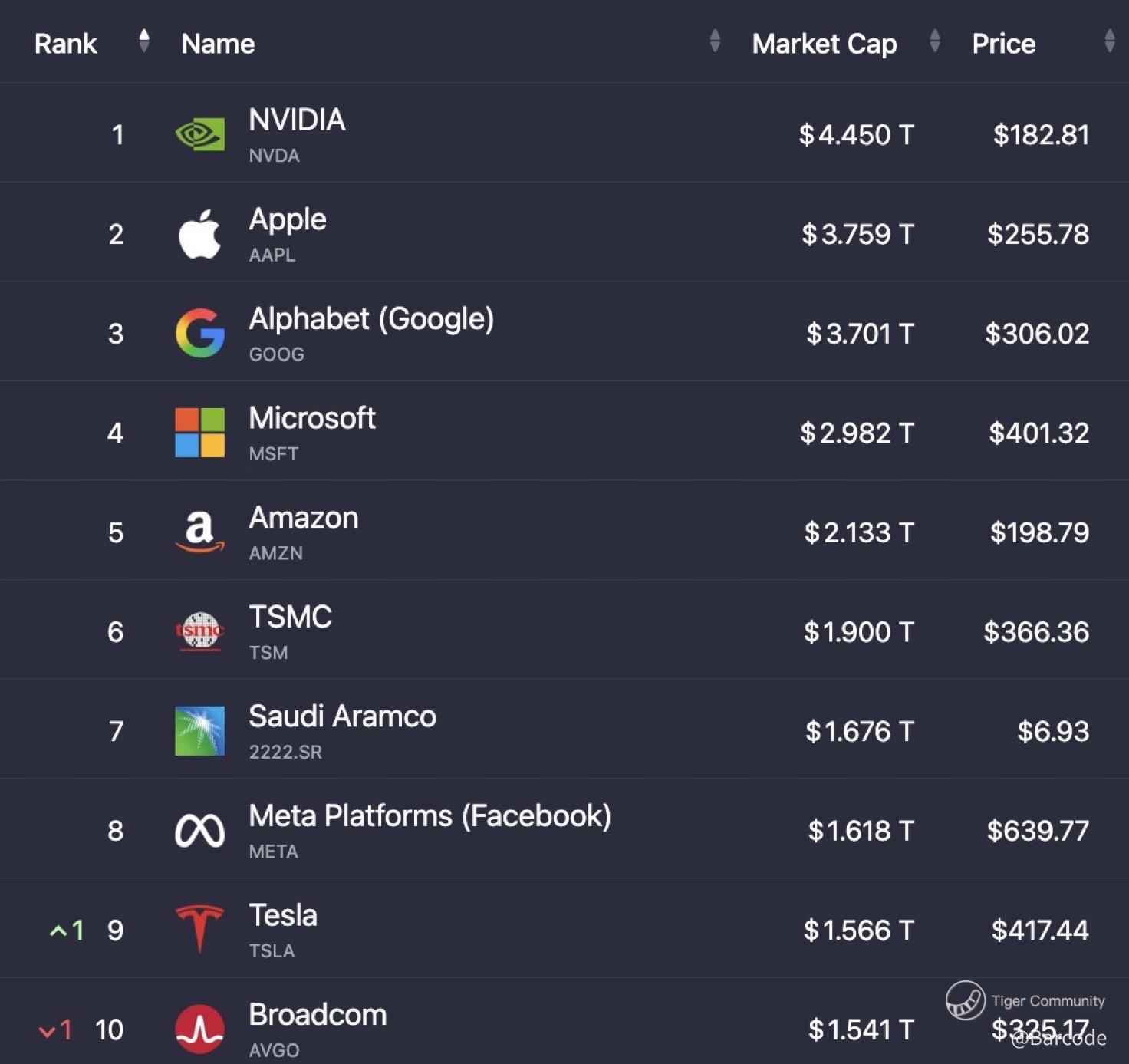 The top 10 largest stocks in the world are now worth a combined $25.33 Trillion, down from $25.99T last week!