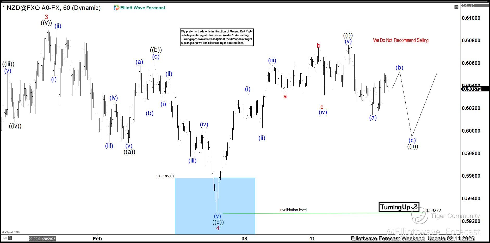 This is the latest 1-hour Elliott wave Chart from the 2.14.2026 Weekend update. In which the pair is showing a strong reaction higher taking place, right after ending the correction within the blue box area. Allowed members to create a risk-free position shortly after taking the long position at the blue box area. However, a break above $0.6092 high is needed to confirm the next extension higher. Targeting $0.6131- $0.6194 ( minimum extension target) and avoid deeper correction lower. As additional data became available, label intensities were refined and corrected to ensure greater accuracy
