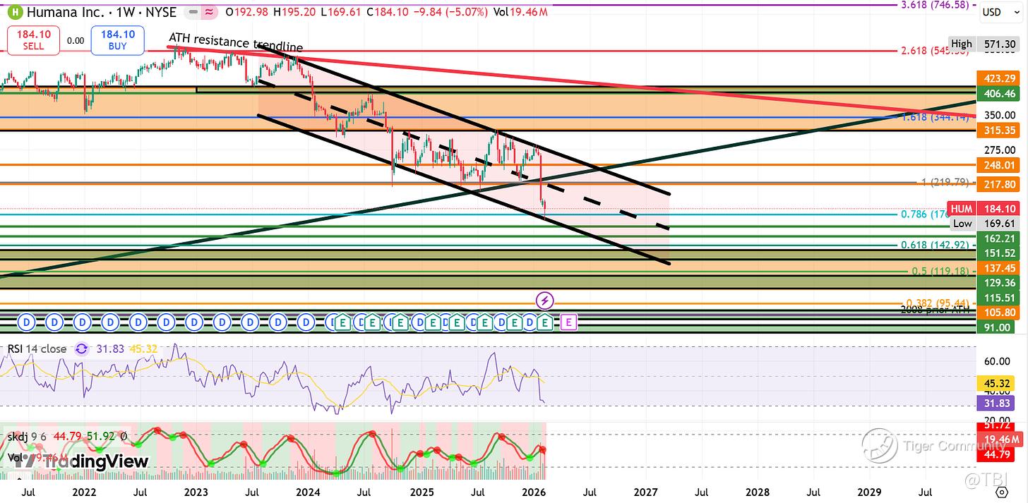 Last week, HUM found support at the 176.73 Fib level. Provided that this level holds, HUM can retrace back into the 217.80 yearly level from below, or even as far as the underside of the long-term support trendline.