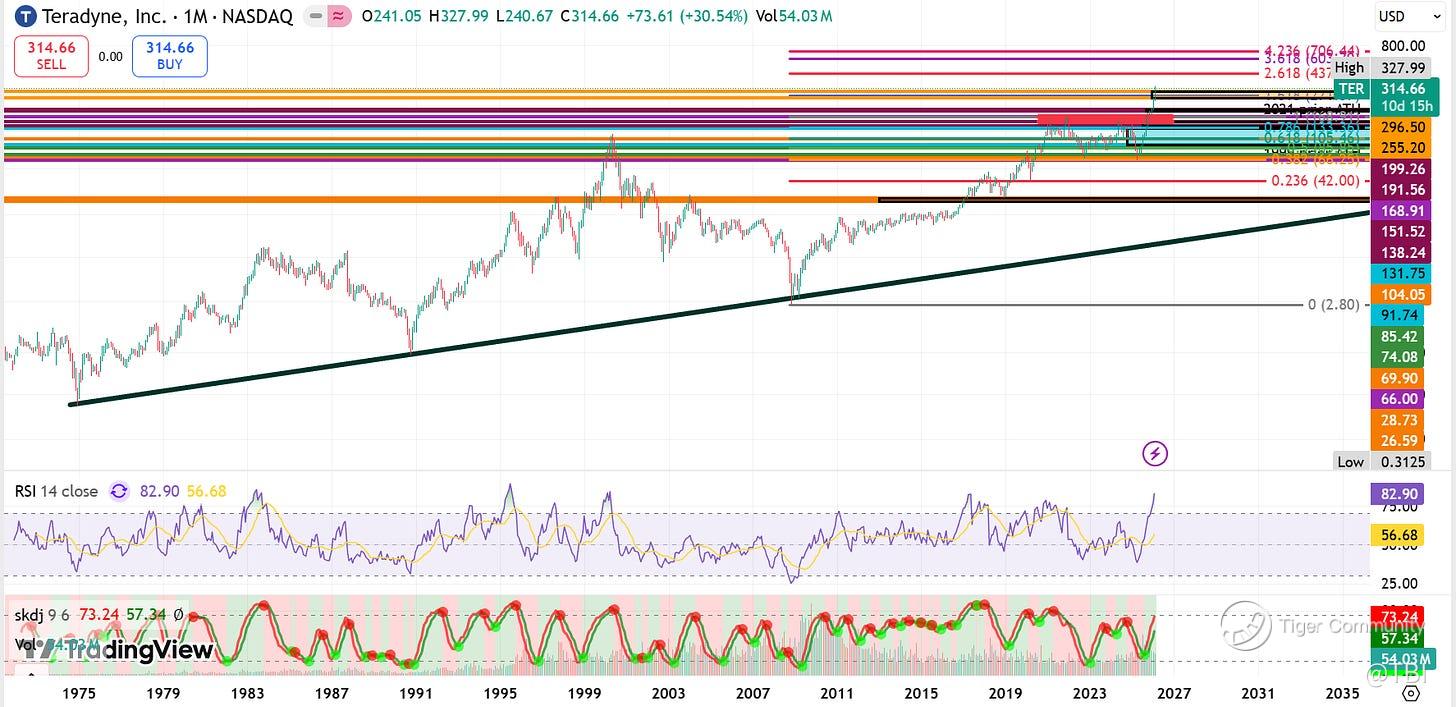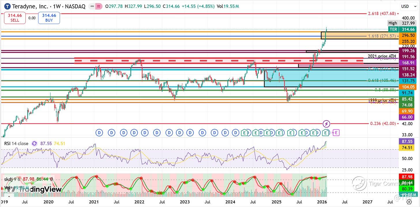 TER is currently trading above its 1.618 Fib extension at 271.57. It also formed a breakaway weekly imbalance at 255-297.