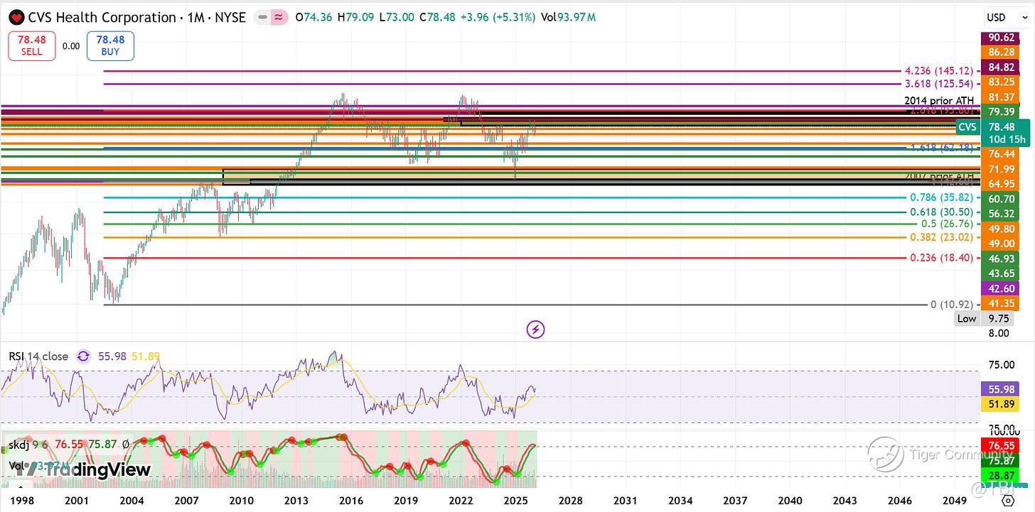 CVS has been unable to hold above the 2014 prior ATH of 98.62. It retraced all the way back into the half-yearly level at 43.65 before bouncing back hard into the red resistance trendline.