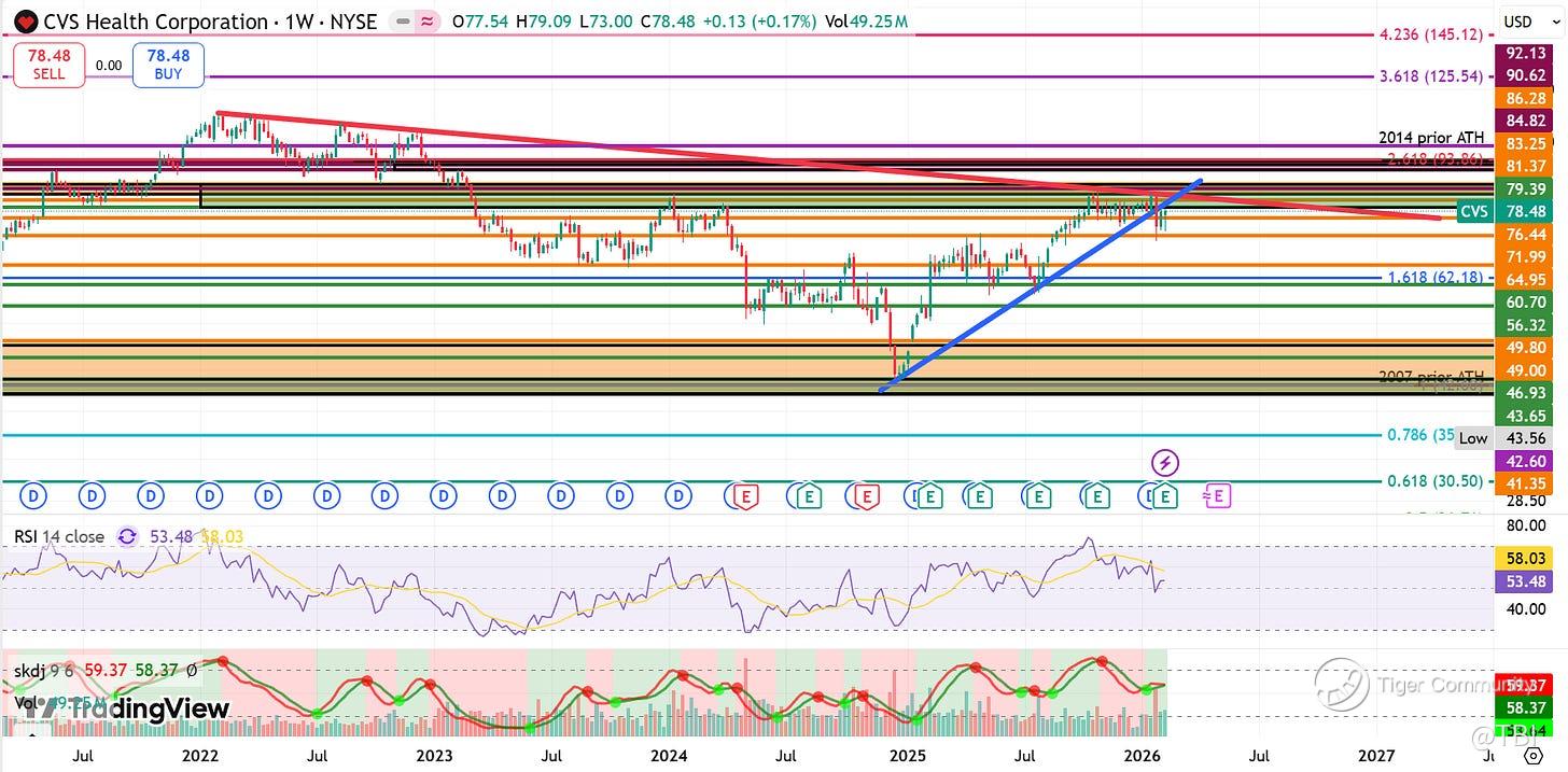 If CVS breaks below 71.99, then it's likely to retrace back into the 62.18 Fib level with time.