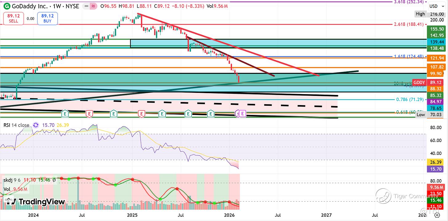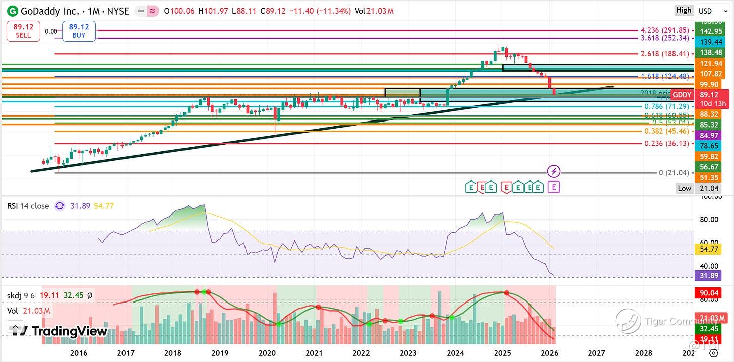 GDDY rejected off its 2.618 Fib level at 188.41 and has corrected all the way into its yearly imbalance at 88.32. It also retested its long-term support trendline at the same time.