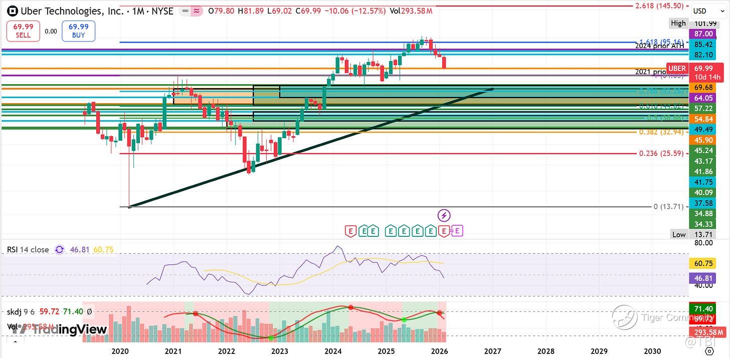 UBER has to break out above the trendline for a shot at retesting the 82-85 quarterly resistance from below.