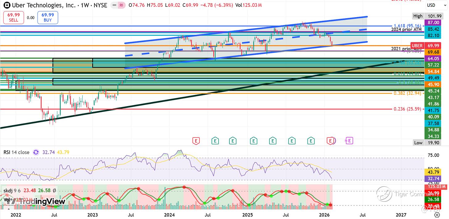 UBER has been trading in an ascending channel for the past few years. It rejected off the 1.618 Fib level at 95.16 and channel resistance towards the end of last year.