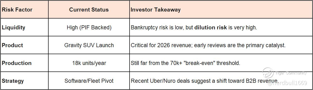 $Lucid Group Inc(LCID)$ is indeed entering a "make-or-break" phase. While the Saudi Public Investment Fund (PIF) provides a unparalleled safety net, the company’s transition from a niche luxury sedan maker to a scaled SUV producer is fraught with execution risk.