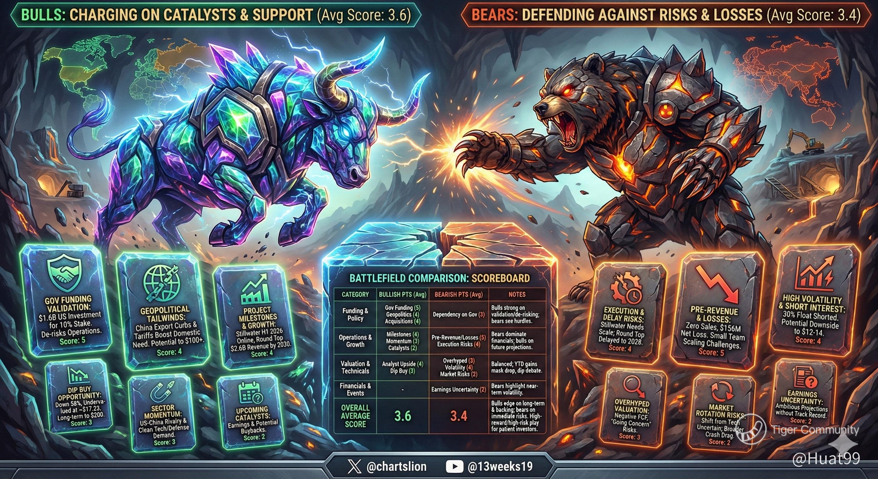 🟢 BULLS (Score 3.6): The $1.6B US Gov investment for a 10% stake is a massive de-risking event. Add in China export curbs, the Stillwater facility launching H1 2026, and analyst targets up to $45. For bulls, this dip is a prime entry to secure domestic supply chain dominance.