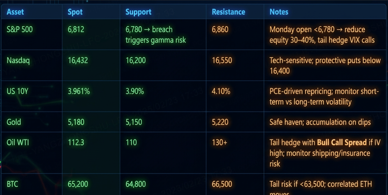 “Markets now price incremental macro signals (PCE 2/26) and discrete geopolitical shocks (Pakistan–Afghanistan war, US–Israel strikes). The first hour of Monday open is critical — observe price discovery before committing. Tail hedges in oil, gold, volatility, and equities must consider IV, liquidity, and supply-chain second-order effects. Non-linear risk dominates early week execution.”