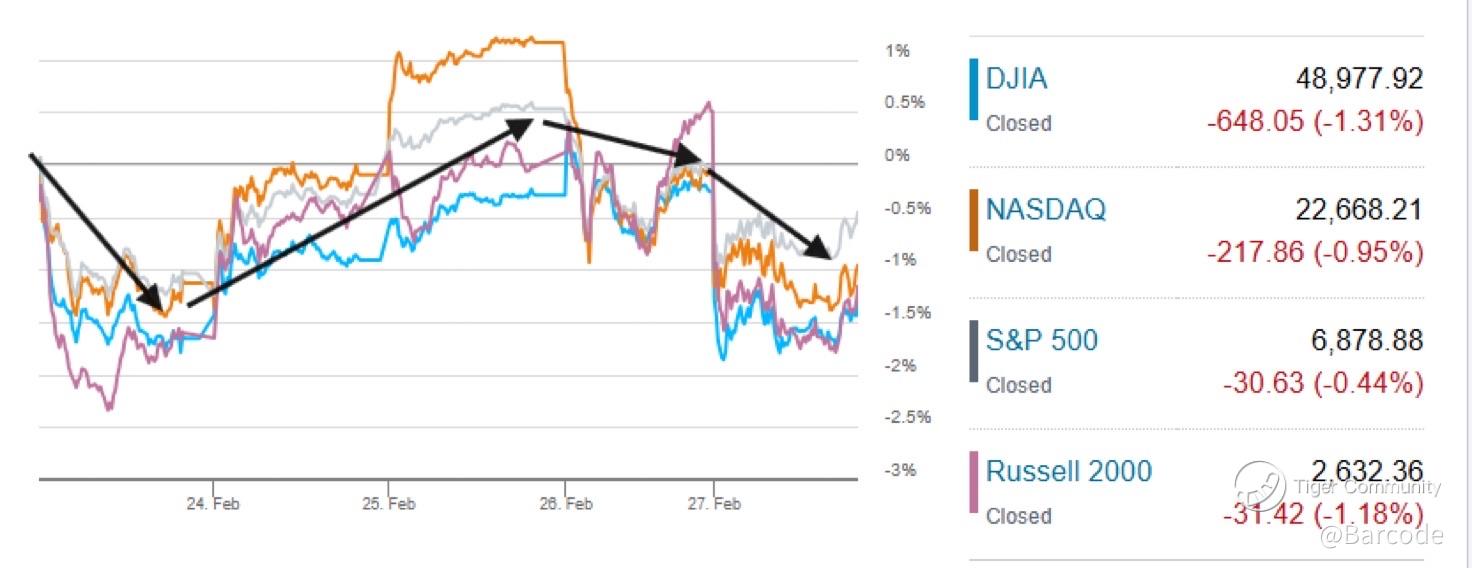 For the week, indices hit their lows on Monday, recovered into Wed's close all getting into the green, stayed up or close through Thurs before falling back to near the lows Fri, all finishing down around -1% except the SPX -0.4% 📉