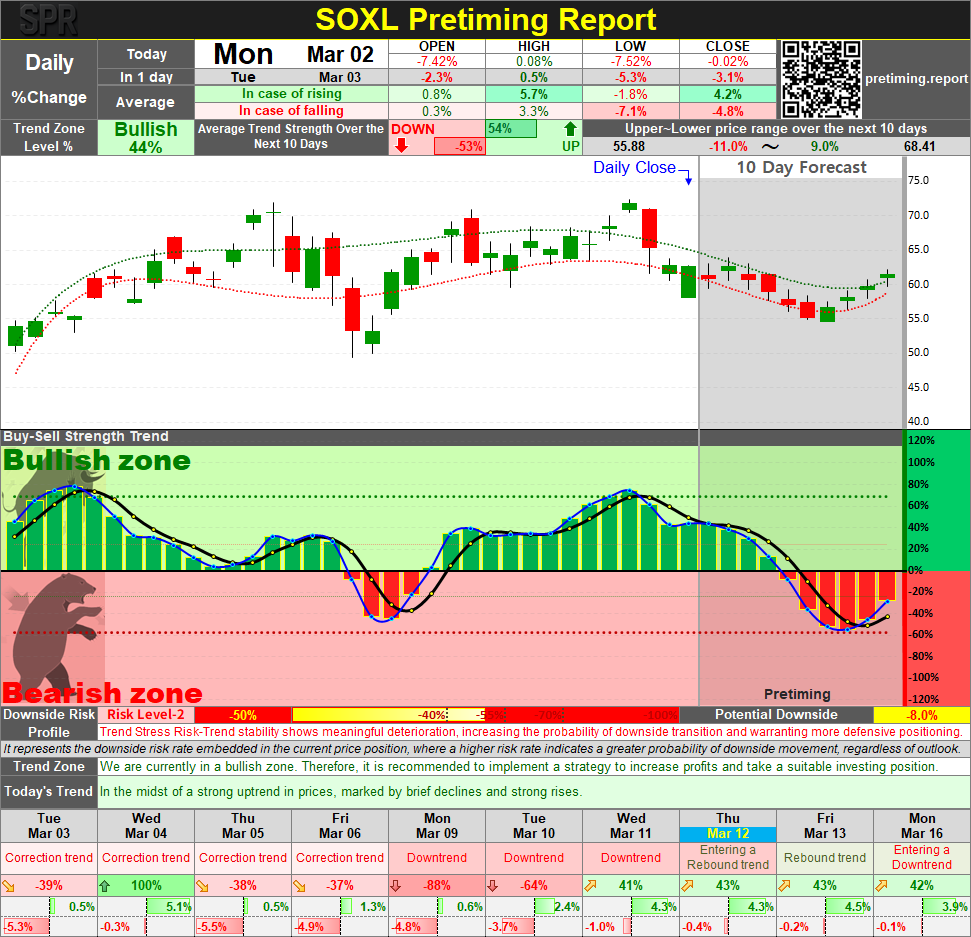 This Daily Market Timing Analysis for SOXL (Direxion Daily Semiconductor Bull 3X ETF) covers the session of March 02, 2026. The report delivers a full analyst-grade assessment of SOXL's price action, long-term Bullish zone positioning, short-term supply flow dynamics, downside risk profiling, 10-day probabilistic price forecast, and a consolidated investment strategy roadmap. Designed to serve both experienced traders and entry-level investors, all data-driven signals are contextualized with clear strategic interpretation.