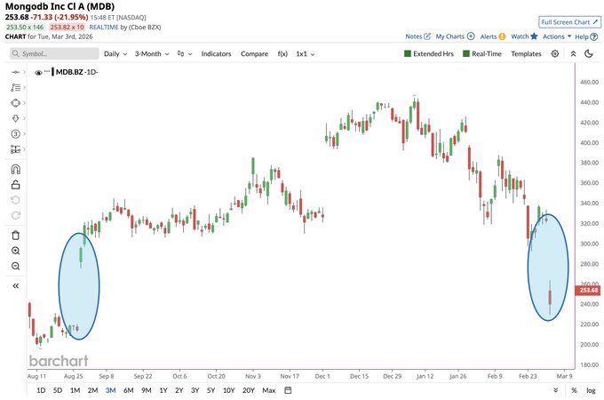 MongoDB having one of its worst days in history 🚨 That's the bad news! The good news is the gap from August has been filled ✅ Is sentiment about to flip bullish? For magnified exposure, consider the Tradr 2X Long MDB Daily ETF $Tradr 2X Long MDB Daily ETF(MDBX)$