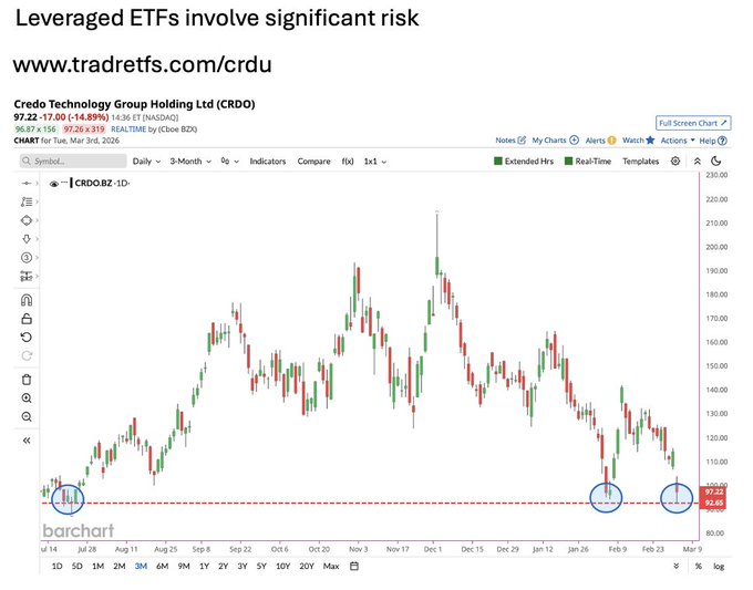 Credo Technology $CRDO on track for largest loss in 14 months 🚨 But perhaps a glimmer of hope for Bulls as it approaches a level that has held strong since July ✅ For magnified exposure, consider the Tradr 2X Long CRDO Daily ETF $Tradr 2X Long CRDO Daily ETF(CRDU)$