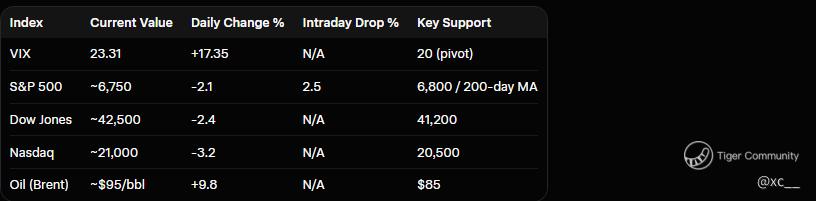 Let's break it down step by step. First, the trigger: Weekend airstrikes lit a fire under global markets, sending crude oil up nearly 10% and flipping the switch to full risk-off mode. Gold smashed through $5,400 as safe-haven hunters piled in, while Treasury yields spiked, signaling bets on hotter inflation and tighter policy ahead. The VIX, which measures expected swings in the S&P 500, leaped 17% in a day β a classic sign of panic covering and hedge funds scrambling to protect portfolios. Historically, when this index breaches 22, it often foreshadows 3-5% pullbacks, but here's the twist: it could also set up prime buying opps if the dust settles fast. π